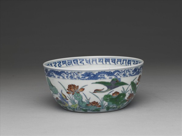 圓形斂口碗,深弧壁,近底處漸下斂,平底,底內凹成淺圈足。以鬥彩技法彩繪紋飾,口沿內外各繪青花五爪龍趕珠及梵字紋一圈。器內外皆以鬥彩技法繪飾蓮塘、鳶鴦,外底青花書「大清嘉慶年製」六字雙行宋體楷款,外加雙方圈。