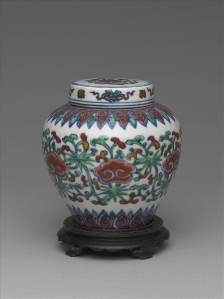 罐,斂口,短頸,豐肩,斂腹,圈足內挖,帶平頂蓋。全器紋飾用釉下青花勾勒,加填各彩,紅彩濃重。蓋面繪一彩芝,蓋壁畫四道家雜寶紋,加飾二道青線。罐肩與腹下各飾變形葉紋一週,腹部繪有纏枝靈芝。底有青花書「大明成化年製」雙圈六字楷款。