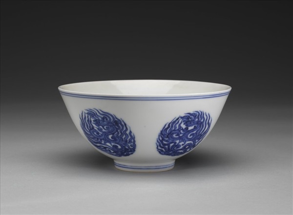 侈口,深壁,圈足。碗外壁青花繪飾五團鳳紋。內壁素白無紋,碗心青花書一梵字。口足各飾青線二道。底青花書「大明成化年製」雙方框六字楷款。