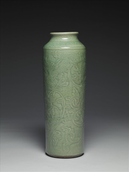 筒狀長瓶。小撇口,圓唇,斜折肩,長腹直下至底。圈足修削而成,足圈無釉色褐,而底部施釉而未成色。肩部刻有雲卷紋,腹壁作長折枝花,減地刻劃,花莖S形曲繞,葉作圖案式四佈。器釉亮而淺淡,表面密佈冰裂狀細開片。
