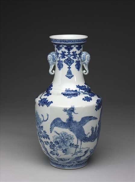 青花孔雀牡丹象耳瓶