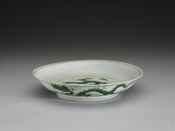 侈口,淺壁弧形,矮圈足。盤心與外壁刻畫雲龍三條,外壁隙地淺劃雙珠、波濤紋。薄胎白釉,龍紋加填綠彩,口足內外分畫綠線四道。底有青花書「大明正德年製」二行六字楷款,外加雙圈。
