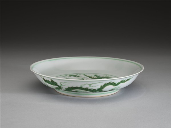 侈口,淺壁弧形,矮圈足。盤心與外壁刻畫雲龍三條,外壁隙地淺劃雙珠、波濤紋。薄胎白釉,龍紋加填綠彩,口足內外分畫綠線四道。底有青花書「大明正德年製」二行六字楷款,外加雙圈。
