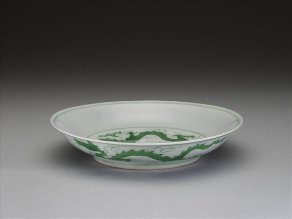 侈口,淺壁弧形,矮圈足。盤心與外壁刻畫雲龍三條,外壁隙地淺劃雙珠、波濤紋。薄胎白釉,龍紋加填綠彩,口足內外分畫綠線四道。底有青花書「大明正德年製」二行六字楷款,外加雙圈。