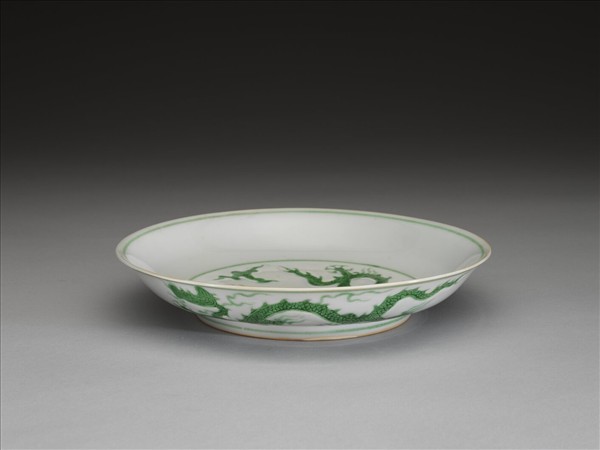 侈口,淺壁弧形,矮圈足。盤心與外壁刻畫雲龍三條,外壁隙地淺劃雙珠、波濤紋。薄胎白釉,龍紋加填綠彩,口足內外分畫綠線四道。底有青花書「大明正德年製」二行六字楷款,外加雙圈。