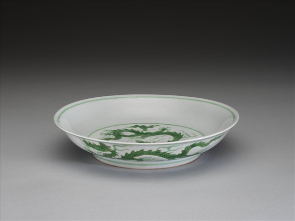 侈口,淺壁弧形,矮圈足。盤心與外壁刻畫雲龍三條,外壁隙地淺劃雙珠、波濤紋。薄胎白釉,龍紋加填綠彩,口足內外分畫綠線四道。底有青花書「大明正德年製」二行六字楷款,外加雙圈。