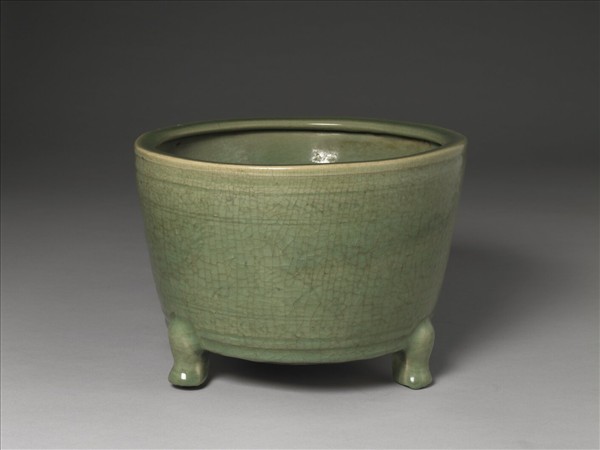 樽式爐,桶形器身,上寬下斂,口部折沿內伸;三蹄足,外底中央貼餅狀凸底,內外壁及足底滿施青綠釉,釉層較薄,遍佈明顯細開片;口緣釉汁下淌,凸底處無釉作朱褐色。外壁上下凸弦紋二道,腹壁似劃花弦紋及折枝圖樣,但輕淺難辨。此件器形與戴維德基金會收藏刻有長篇款識,記為正德丁丑(1517)處州府麗水縣民陳鍔供奉寺廟的香爐相似。