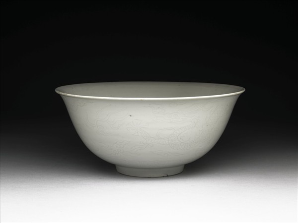 侈口微撇,弧形壁,圈足。全器施白釉,釉色白淨腴潤,碗心淺劃盤龍一,外壁做雙龍戲珠,近圈足處飾變形蕉葉紋一圈,線條細淺,細膩具流動感。器底青花書「大明隆慶年造」二行六字楷款,外有雙圈。