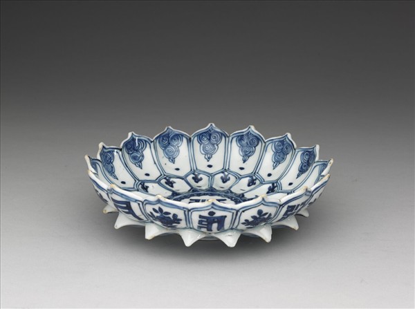 青花瓷是萬曆時期瓷器的主要品類,燒造數量龐大、種類繁多。這件瓷盤侈口、淺壁、矮圈足。盤身呈蓮花形,內外分三層,各十六瓣。花瓣均用青花鈎勒,上層內面畫勾雲紋,外面書八字梵文及八折枝花卉。盤心書梵文「佛」字,週飾如意雲兩圈。底部有「大明萬曆年製」青花楷體款識。