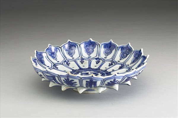 蓮花式盤,淺壁,矮圈足。以兩層各十六片長形蓮瓣組成,每瓣皆模印成內凹外突起的花瓣狀,瓣尖外侈。外壁下層的花瓣瓣尖於盤壁中腰處向外浮挑出;使全形宛如中央圓形花心外圍以雙層蓮瓣的大朵盛開蓮花。全器中央書一梵文種子字,外壁也間隔書一梵字,每一梵字代表佛身,正彷彿八佛統合於中央佛的壇城形式。密藏佛教中一種可開可闔的金蓮花式壇城,闔為花苞、開而佛現;此瓷盤似取壇城開敞的樣式。這也是藏傳佛教長期影響明代宮廷的一種表現,只是梵字多有錯筆,可能是工匠並不深解筆劃,同樣的情形也見於其他漢地工藝品。全器內外花瓣均用青料雙線勾勒邊框, 框內加飾圖案;上層內面的花瓣框內畫圈線疊成的勾雲紋,外面框內畫梵文八字間飾花卉八枝。下層內外框內簡筆綴飾苜蓿葉與瓣脈。盤心梵字周邊飾如意雲 兩圈,紋線密實,有如蓮心籽實狀。外壁近足緣處勾尖首雲紋一周,則如花蒂托葉。足底書「大明萬曆年製」雙圈六字楷款。從正面或背面的全形紋飾看來,全器以一個個的開光框格組成,每個開光內各飾圖案;製作時又瓣稜起伏:這些 裝飾習慣與萬曆時期銷往歐洲的貿易瓷有相似的跡象,而後者以大小錦地開光組成的裝飾 形式,通常泛稱為「喀拉克」瓷,廣受歐洲市場歡迎。明代後期, 內廷經常要求官窯燒造奇巧造形的器用, 如圍棋盤、屏風、龍缸之類,滿足帝王各種好尚需求。萬曆朝皇帝篤尚佛教,此件浮雕層重、雕作複雜的蓮花形器,正也說明此種明晚期官窯燒造的現象。
