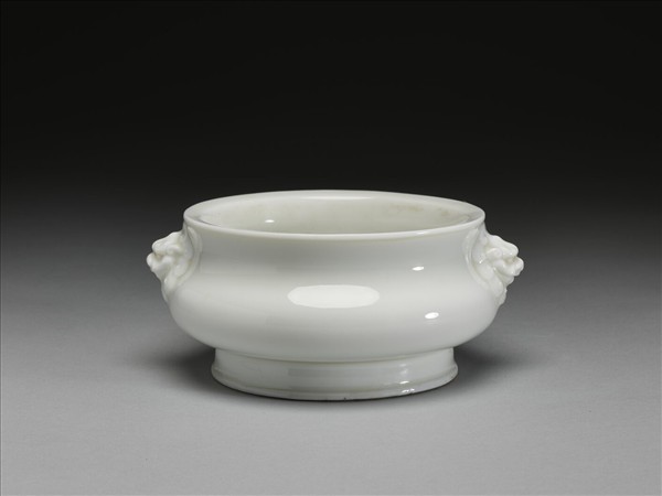 簋式爐。敞口、扁圓腹、圈足。腹兩側有浮塑的獅首。內底中微凹。全器施乳白釉,釉色潔淨,僅足圈無釉露白胎。器底釉下模印陽文楷款︰「大明成化年製」六字三行方框,印文輕淺。德化窯址在福建德化縣,自宋代已燒製瓷器,明中葉至清代前期尤盛,以乳白凝厚釉色著稱,有呼之為「白建」者。其販銷海外者,頗受西歐人士之喜愛,贏得「中國白」之美稱。該窯所製文房用具,如筆筒、筆洗、水注、印章、爐、瓶、盒等亦多,器下年款與一般民窯習慣相似,常託名為宣德、成化之作品以自高,而實際製作多在十七世紀前後。
