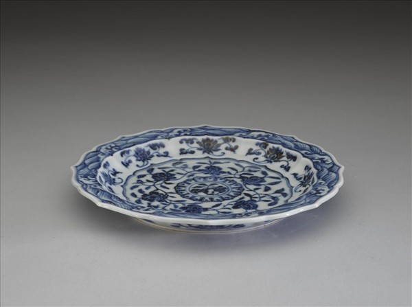 盤子模製而成,呈八瓣花形,折沿,帶寬唇,低淺壁,矮圈足。胎骨較厚,除器底無釉露胎外,內外壁皆以青花為飾。口唇上畫海水波濤紋,內壁畫番蓮花八枝,盤心一圈內劃折枝牡丹,外有雲頭紋及花卉裝飾。外壁畫折枝四季花卉八組。景德鎮珠山遺址可以看到尺寸相彷彿的洪武時期杯盤組合。洪武時期的作品在盤心處凸起一圈,來放置小杯,永樂時期的作品則以繪畫紋飾一圈,取代洪武的作法。