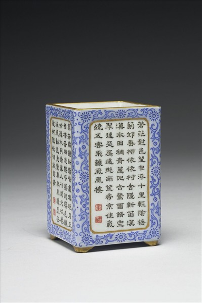 筆筒呈長方形倭角,直壁深腹,平底,下接四矩行足。通體施白釉,外壁四開光,內墨書隸體乾隆御製詩〈燕山八景詩〉(1731)中之後四景詩〈薊門煙樹〉、〈盧溝曉月〉、〈居庸叠翠〉、〈金臺夕照〉詩下各以紅料書「乾」「隆」「御」「製」「惟」「精」「惟」「一」朱白印文。開光框線均以金彩鉤描,之外隙地則先以半透明白料先敷底色,再以藍料描繪卷草圖案花,胎體勻厚,口沿、四矩形足均加飾金彩,底心紅料書「大清乾隆年製」六字三行篆款。