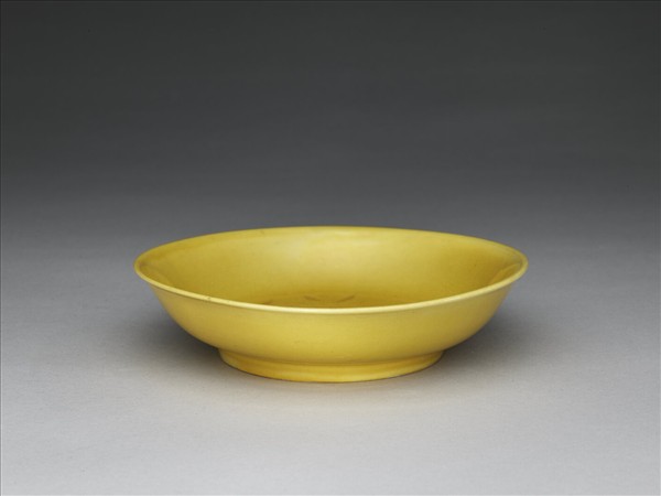 侈口窄唇,淺壁,矮圈足。胎質較薄,器內外壁滿施嬌黃釉,盤底純白,樸素無紋飾。底有青花書「大明正德年製」二行六字楷款,外加雙圈。