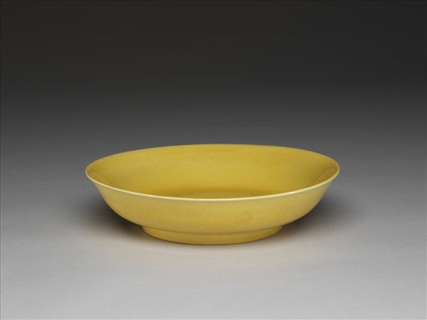 侈口窄唇,淺壁,矮圈足。胎質較薄,器內外壁滿施嬌黃釉,盤底純白,樸素無紋飾。底有青花書「大明正德年製」二行六字楷款,外加雙圈。