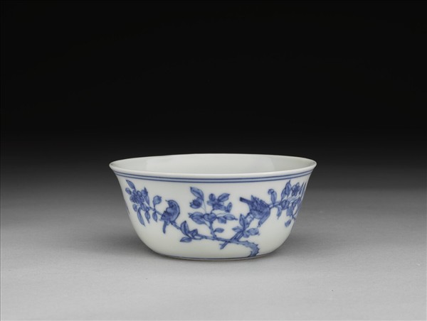 侈口窄唇,矮壁,圈足矮淺。外壁青花繪飾花鳥圖,二組對鳥戲於花果枝葉間,四鳥飛、鳴、食、宿各有不同姿態。內壁素白無紋,器心書五方梵字,圈圍如十字杵。口足共飾青線三道。底青花書「大明成化年製」雙方框六字楷款。