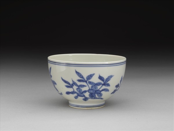 斂口,深弧壁,圈足。外壁青花繪飾畫折枝花果紋,杯內素白無紋。口足分飾青線四道。底青花書「大明成化年製」雙方框六字楷款。