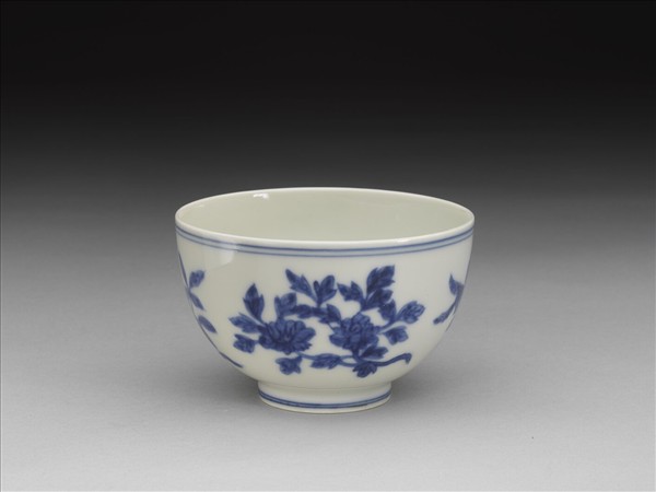 斂口,深壁,矮圈足。外壁青花繪四折枝花果紋,有桃實、牡丹、柿子、石榴花,胎骨勻薄,質堅細膩,胎釉一線泛橙黃色。青花淺淡略灰,內壁白釉泛黃色。底青花書「大明成化年製」二行楷款,外加雙方框。這類斂口、圓腹、深壁,口徑九公分左右者,清宮舊帳大多登錄為茶盅,明代是否亦作茶盅之用,雖無文獻可徵,但以尺寸、形制而言,似與直壁茶盅相近。