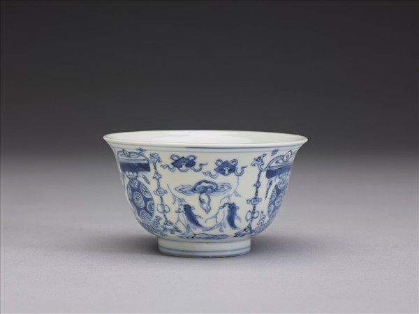 撇口茶鍾造型,器內白釉無紋,器外青花畫三組「年年豐登」圖,分別為雙鯰魚、磬紋、蜜蜂、燈籠、及稻穗等,採諧音為「年年有餘,慶豐登」的吉祥寓意。胎體輕勻細薄,釉色灰青淡雅,口足各有青線二道。外底為凸尖,白釉上青花書「大明成化年製」六字二行偽托款。 茶鍾明顯為明末萬曆官窯仿成化作品,但製作精細,收藏於儲存明代瓷器的景陽宮內,作為明末茶鍾樣式亦屬珍貴。《點查報告》上或依據清宮舊籤定為「青年年豐登茶鍾兩件」(故瓷016237、故瓷016238)。「年年豐登」吉祥紋飾常見使用於萬曆青花、五彩作品,這類紋飾相似的豐登圖可從院藏萬曆〈青花年年豐登酒圓〉(故瓷009178)、〈青花仙人豐登磬口碗〉(故瓷006717)或北京故宮博物院所藏五彩五穀豐登盤等見其形象。