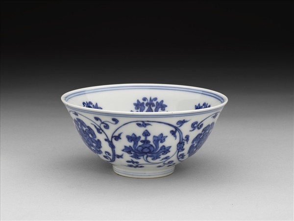 侈口窄唇,深壁,圈足。碗外壁青花繪纏枝花卉紋。碗內壁畫六朵寶蓮,碗心一圖案式雪花紋。內外各飾青線四道。底青花書「大明成化年製」雙圈六字楷款,款字釉色較淡。