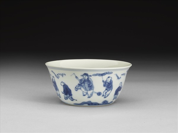 侈口,窄唇、弧形壁、淺圈足內凹。器內底心青花繪松、竹、梅歲寒三友,圍以雙圈,青花釉色濃暗。器內壁素白無紋。外壁以青花繪十子嬉戲圖。器底青花書雙圈「大明嘉靖年製」楷體六字款。