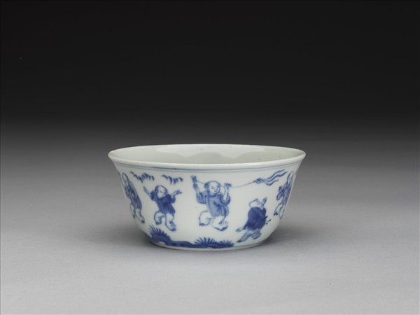 侈口,深壁,平底,淺凹足。器內青花繪松竹梅三友及湖石,圍繞青線二道。外壁十童子嬉戲於庭院,有放風箏、騎木馬、戲木偶等。青花釉色青灰較淡,白釉泛青,底部略黃。器底青花書「大明嘉靖年製」六字二行楷款,外加雙圈。這類平底瓮肚器,口徑十公分左右者,清宮舊帳大多登錄為茶盅,明代是否亦作茶盅使用,雖無文獻可徵,但以口徑尺寸而言,亦與撇口圈足茶盅相近。