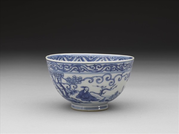 侈口,圓弧壁,矮圈足。口沿一圈卷草紋,外壁繪二高士盤坐樹下,一回首觀蓮,一賞梅;二童子分路行來,一抱琴,一捧書冊;內底心畫一士人倚靠蓮池畔,仰頭賞月。青花釉色淡雅勻淨,底青花書「大明嘉靖年製」六字二行楷款,外加雙圈。這類口徑十公分左右的小碗,明代以來大多作為茶鍾使用,嘉靖時期或受晚明嗜茶風氣影響,飲茶用器頗為流行,不僅形制多樣,甚至青花用色、或繪工均特別講究。