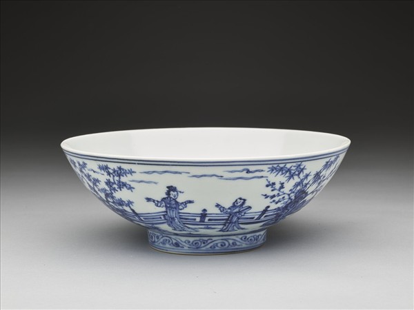 侈口,弧壁,矮圈足,底微凹。外底凸起。外壁繪庭園內種植湖石竹梅,一仕女手舞足蹈,一侍女執扇,比手作呼應狀,另一侍女捧包袱由室內拾級而下,另一邊仕女雙手拱垂胸前,一侍女比手回顧。青釉濃艷,多帶鐵褐疵斑。胎骨勻厚,質堅細膩。底書「大明宣德年製」二行六字楷款,外加雙圈。
