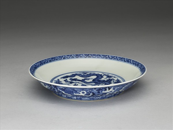 撇口窄唇,淺壁,圈足。以釉下青花繪飾。青料色濃,圖繪輪廓明顯,渲染均勻。盤外壁勾勒九白龍於深青波濤間,圈足外壁上下波濤紋之白浪頭皆有青點。盤內口緣一圈鋸齒紋間飾朵花,盤心一龍穿於雲間。內外共飾青線十道。底青花書「大明成化年製」雙圈六字楷款。