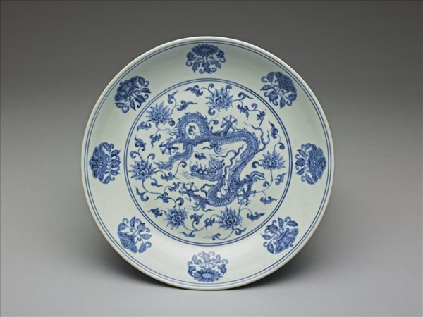 撇口、弧壁、淺盤,全器除圈足著地處均施釉。盤心雙圈內描繪一雙角五爪龍,並以番蓮纏枝紋填隙,器內壁則繪團花八朵,近口沿處飾複線弦紋。器外壁描繪兩條行龍,亦長身悠游於番蓮纏枝紋間。足內帶「大明成化年製」六字雙行楷書雙圈款。成化官窯使用國產「平等青」作為青花原料,相較於前朝,青花發色已無鐵斑,且呈色淡雅。此外,從這件作品看來,雖然成化官窯以小型器皿聞名,但大盤品質仍佳,且紋飾描繪細緻。
