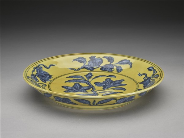 侈口窄唇,淺壁,矮圈足。內壁畫青花石榴、葡萄等四種果實,盤心畫玉蘭一枝。外壁畫轉枝牡丹花七朵。內外分畫青線十道。原為白地青花,加施黃釉一層。底有青花書「大明弘治年製」二行六字楷款,外加雙圈。
