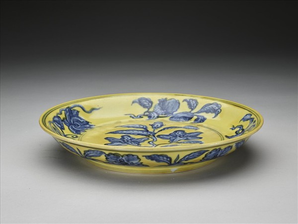 侈口窄唇,淺壁,矮圈足。內壁畫青花石榴、葡萄等四種果實,盤心畫玉蘭一枝。外壁畫轉枝牡丹花七朵。內外分畫青線十道。原為白地青花,加施黃釉一層。底有青花書「大明弘治年製」二行六字楷款,外加雙圈。