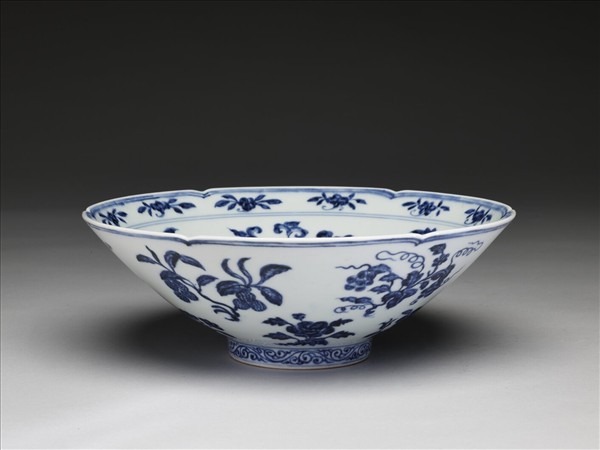 碗,六瓣葵花形口,深壁,矮圈足。碗內口沿下兩道弦紋間畫各種花卉十二朵,內壁畫四季花卉六枝,底心三圈弦紋內畫桃實一枝。外壁口沿下弦紋兩道,器身畫折枝花、果分上下二層各六枝。足壁上下圈畫弦紋兩道,內飾卷草紋一周。器外底青花雙圈書「大明宣德年製」兩行楷款。