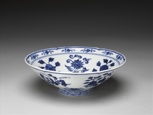 碗,六瓣葵花形口,深壁,矮圈足。碗內口沿下兩道弦紋間畫各種花卉十二朵,內壁畫四季花卉六枝,底心三圈弦紋內畫桃實一枝。外壁口沿下弦紋兩道,器身畫折枝花、果分上下二層各六枝。足壁上下圈畫弦紋兩道,內飾卷草紋一周。器外底青花雙圈書「大明宣德年製」兩行楷款。