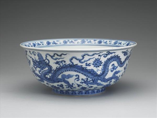 撇口,折沿,深弧壁,圈足。外壁主紋為蛟龍一對行走轉枝蓮花間,足邊如意雲紋一周,口沿、足邊共飾青線五道。器內沿邊裝飾轉枝蓮紋,上下加飾青線四道,器心則繪一穿蓮蟠龍,外加雙青線。青花濃艷均勻,偶帶鐵褐色的結晶鐵皮繡斑,白釉泛青。胎骨稍厚,圈足露胎處,白釉堅緻細膩,遺有墊餅滲染鐵斑。器底青花書「大明宣德年製」二行六字楷款,外加雙圈。