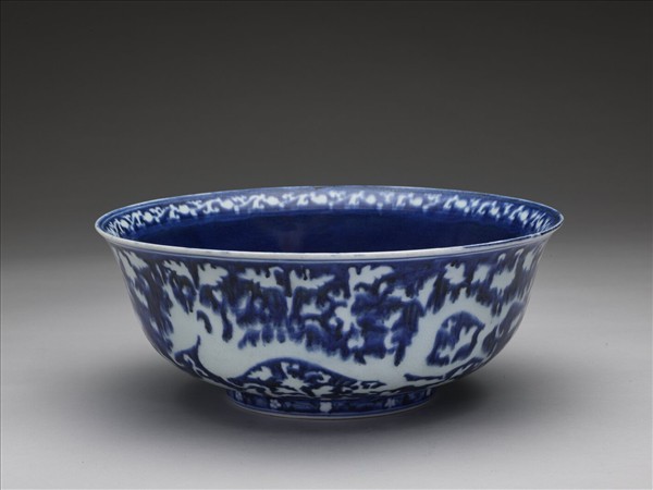 撇口,折沿,深弧壁,圈足。此碗內外均以藍地白花技法裝飾成花紋,外壁在胎土未乾前,先錐劃雙龍穿行於轉枝牡丹花中,內面碗心雙圈內則錐劃一龍於轉枝蓮叢內,折沿口上刻劃轉枝花卉,足圈鉤劃梅花十朵,花紋留白,僅見錐劃的刻紋及白龍紋上的青花點睛,隙地滿施青料。胎骨稍厚,白釉泛青,圈足露胎處,白胎細膩,胎釉一線呈淺橘色,器底雙圈內書「大明宣德年製」二行六字楷款。