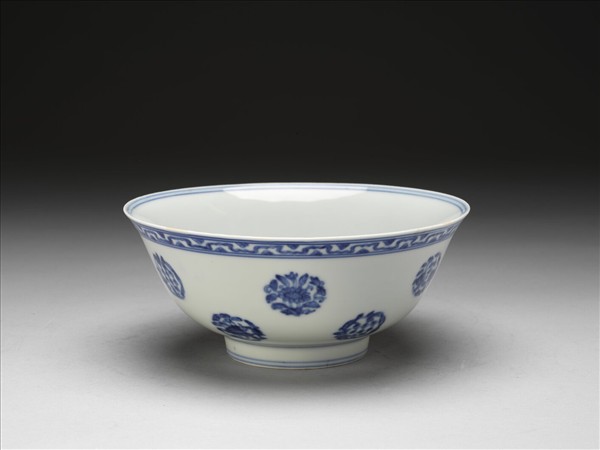 侈口窄唇,深壁,圈足。以釉下青花繪飾。碗外壁青花繪飾四季團花果十二組,外口緣圖案式折帶朵花紋一週。內壁素白無紋,碗心折技菊三朵。內外共飾青線十一道。底青花書「大明成化年製」雙圈六字楷款。