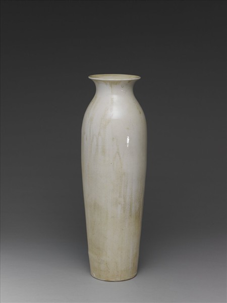 撇口,束頸,削肩,器腹深長向下收斂,平底,挖成淺圈足。通體施透明釉,釉表白色泛黃綠。