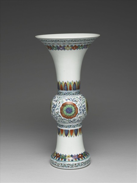 仿銅觚,喇叭口,長頸,小鼓腹,長脛外撇,淺圈足。外壁以鬥彩繪飾紋飾,腹部彩畫纏枝番蓮四朵,口唇下及頸、脛、足部,分別繪飾勾雲紋、連珠紋、如意雲紋、蓮瓣紋、勾雲紋;頸部與脛紋飾方向大致呈上下相反對稱。足端露胎。
