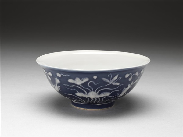 霽青釉白裡蓮塘魚藻紋碗