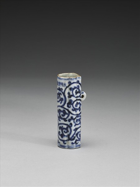 通體呈五曲(一大四小)四凹棱筒形,帶繫孔的一面為扁平狀,芒口,平底。器面及底部均以青花畫纏枝卷草紋,口、足、底各加畫雙青線,繫孔上亦裝飾青線一道。青花濃重,多帶褐綠色斑及結晶疵斑,釉面有開片紋。口沿露胎無釉,採用覆燒技法。口沿下青花橫書「大明宣德年製」一行六字楷款。