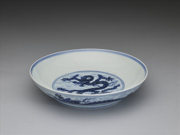侈口,淺弧壁,矮圈足。盤心畫一張口、吐舌、露齒、舞爪的游龍,隙地則飾以淺青波濤紋,內壁白釉上印飾雙龍。外壁亦分別以深青、淡青繪飾雙龍波濤,及濃青四仙山,口足間加飾青線六道。胎骨均勻,釉色青艷,白胎細膩堅緻。底書「大明宣德年製」二行六字楷款,外加雙圈。