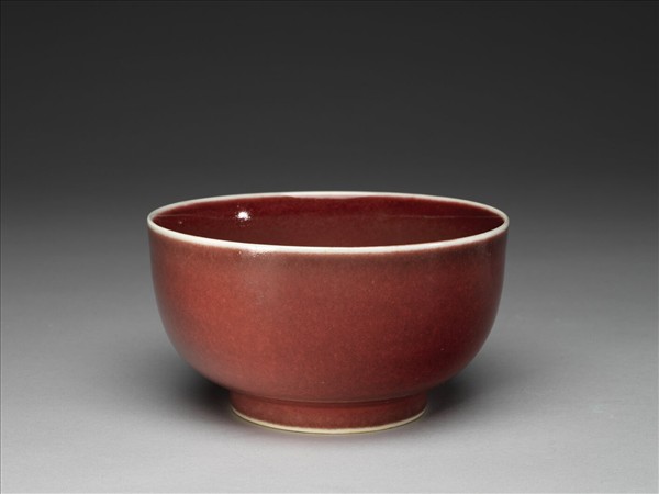 斂口,深直壁,矮圈足,通稱「墩子碗」。內外均施鮮紅釉,樸素無紋,碗底純白,口、足均露「燈草白」白邊一道。紅釉深淺交錯,內壁較勻,全器橘皮紋針眼明顯。胎骨稍厚,露胎圈足,質堅細膩。底白釉上青花書「大明宣德年製」二行六字楷款,外加雙圈。