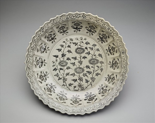 折沿菱花口大盤,器壁分十六瓣,凹凸起伏與花口相呼應,口部略歪斜,內底寬平,中心主紋飾為太湖石上一叢四株帶苞菊花,是洪武官窯常見主題。內外壁每瓣折枝間描繪蓮花折枝,口沿裝飾海水紋,設計樣式與描繪風格十分端正。青花呈鐵褐色,釉層厚且泛灰,縮釉現象明顯,底厚而挖足淺,圈足著地處與內緣無釉,露胎處呈橘色。類似作品亦見於1994年景德鎮珠山東門頭洪武地層。