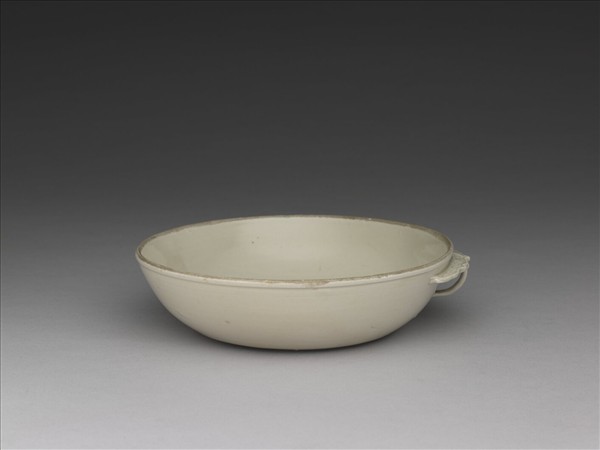 敞口碗形、淺壁、平底、口邊淺稜微凸起,稜下一側平伸出四瓣如意式?沿,約佔五分之一器周,下接窄扁泥條半環狀耳;?沿表面押印卷草紋,紋理清晰。碗身陶輪成形,外壁留有鏇痕;?與耳係外接於碗身,有修刀押泥的接痕。釉色牙白,有流釉淚痕。這種過去稱為「洗」的器形,實為北宋、南宋與金朝皆盛行的官方酒器造形。