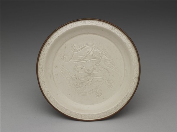 折沿盤,弧形淺腹,臥足、平底。平折沿上快刀勾劃卷草紋,鑲銅稜釦。盤面刻劃雙鳥上下對飛,尾羽拖曳旋繞,恰銜為以鳥首為中心環飛團轉的圖像。雙鳥近似練鵲類長尾禽,線條全以直向運刀刻成,並無劃花風格成熟期之斜刀、回刀、篦紋等刀法變化。與太宗李后墓(1000)的鳳紋碟刀法與迴旋之勢相似;惟後者刻痕更如針尖細銳輕淺。