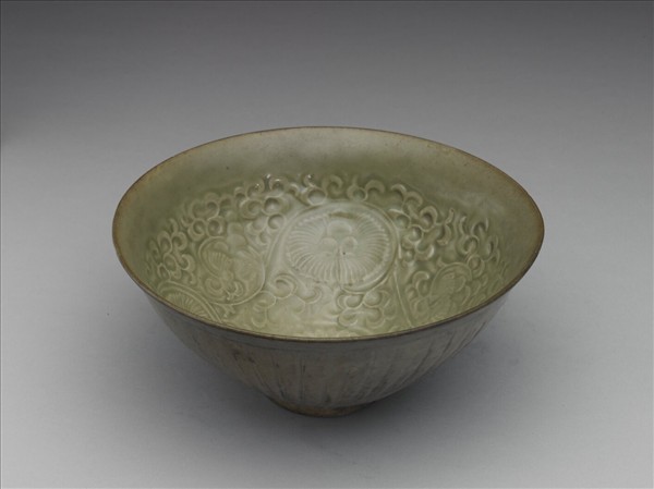 侈圓口,深壁,上豐下斂,圓底,矮圈足。器內滿印轉枝菊花紋。外壁劃斜線摺線。胎骨堅薄,油青色微綠。外壁多磨擦痕,足底露灰褐色胎。