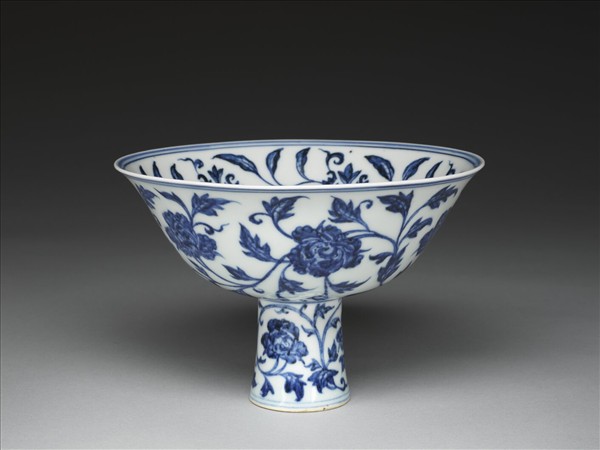 撇口,深弧壁,高足微侈,足中空。外壁飾轉枝牡丹六朵,高足三朵,內壁則畫轉枝芍藥六朵,器心土坡草花一株,各區紋飾間均以青線二道隔開。碗壁胎骨勻薄,高足稍厚,青花釉色艷麗,多帶黑褐疵斑,白釉泛青,釉內密佈大小氣泡。圈足露胎,潔白堅細,胎釉一線呈淺橘色。圈足內青花書「宣德年製」四字楷款。