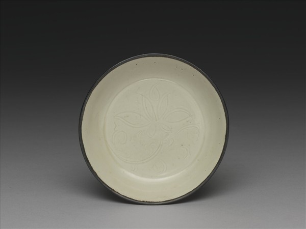 侈口淺壁平底小盤,全器滿釉僅口部鑲銅稜釦。器底心劃萱花一枝。這是定窯瓷器中最常見的一種,在金代窖藏、墓葬中最為常見,如陳慶夫婦墓(1159)、馬令夫婦墓(1184)均見相似文樣。簡單的圖樣,勾勒數筆,便充滿全器面。刻劃的匠工熟練的以順向刀筆與回鋒的變化,將深斜的片狀陰影與銳直的線條,構成筆描與暈染共呈的效果,畫意流暢,而每件作品均熟練而自在,各有細節的差異。