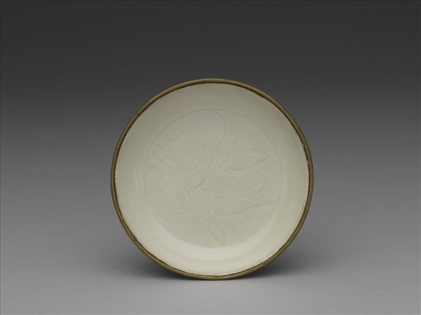 侈口淺壁平底小盤,全器滿釉僅口部鑲銅稜釦。器底心劃萱花一枝。這是定窯瓷器中最常見的一種,在金代窖藏、墓葬中最為常見,如陳慶夫婦墓(1159)、馬令夫婦墓(1184)均見相似文樣。簡單的圖樣,勾勒數筆,便充滿全器面。刻劃的匠工熟練的以順向刀筆與回鋒的變化,將深斜的片狀陰影與銳直的線條,構成筆描與暈染共呈的效果,畫意流暢,而每件作品均熟練而自在,各有細節的差異。